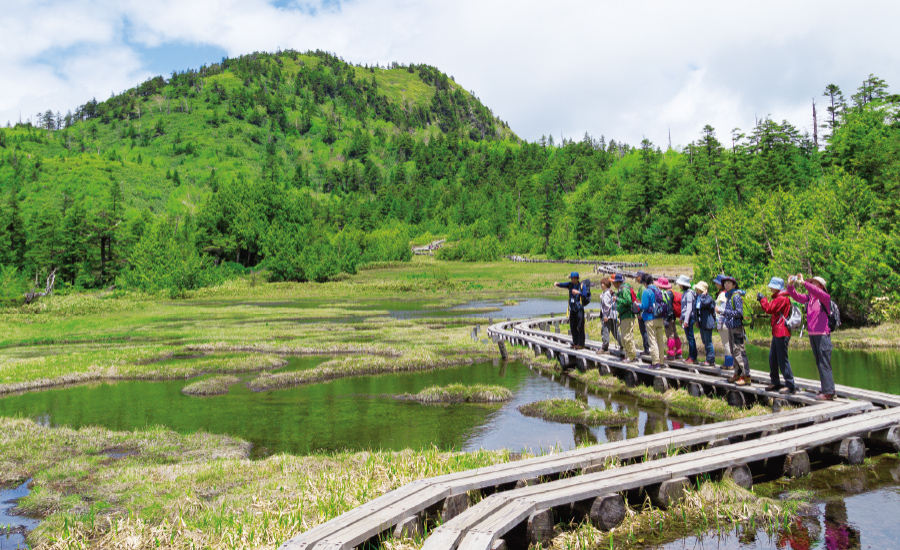 蓮池や夏のゲレンデ、丸池、琵琶池などへ。その日の自然やご希望に合わせて、ゆっくりのんびりと。穏やかな起伏はありますが、どなたでも安心してお楽しみいただけます。