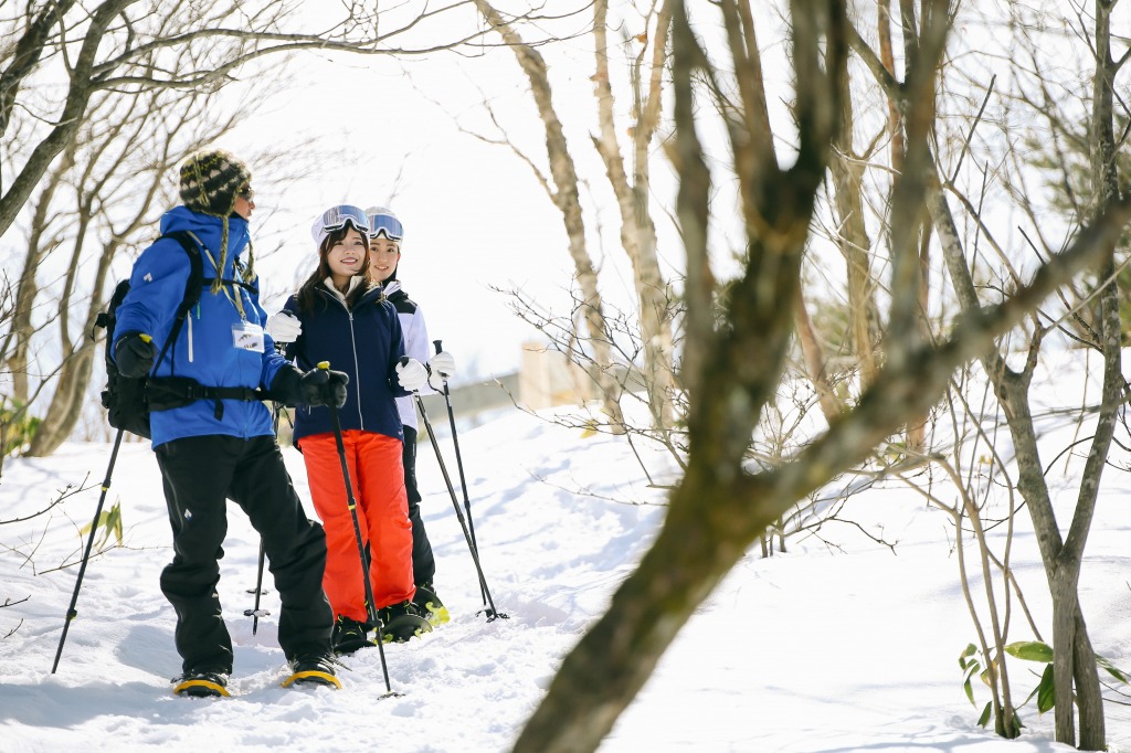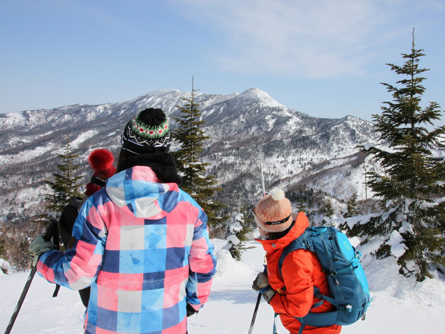 Mt. Yakebitai course starts with walking in winter jungle towards large snow field with panoramic view.