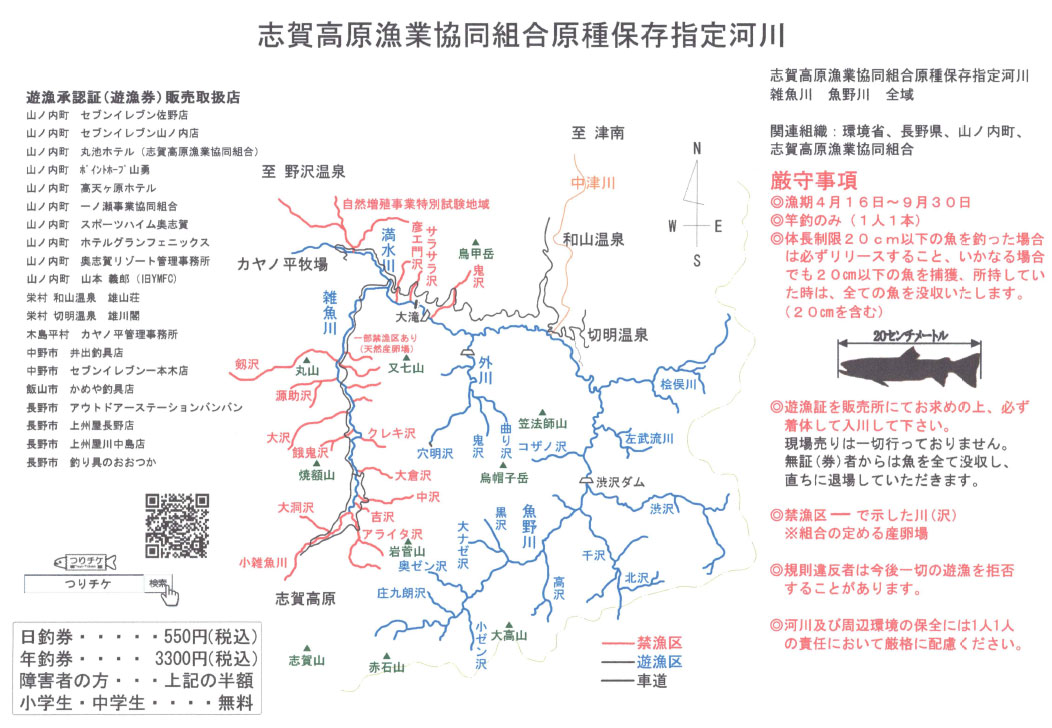 日釣券 500円(税込) 年釣券 3,000円(税込) 小中学生は無料 身障者の方は半額 日釣券 250円(税込) 年釣券1,500円(税込) ※遊漁証の現場売りは一切しておりません。無券者は魚を全て没収し、直ちに退場していただきます。 ※購入後の払い戻し(キャンセル)は一切認めませんのでよくご判断の上お求めください。 |