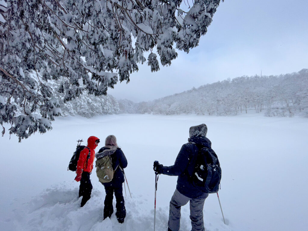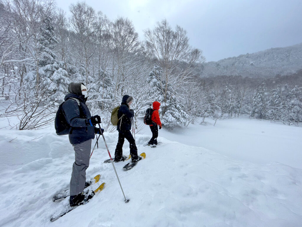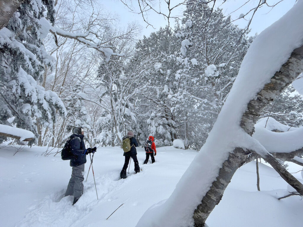 本日のツアーも山頂🏔へ行く予定だったのですが、まだまだ激しい降雪❄️のため安全地帯にて短時間のお散歩コースへ変更に🌲