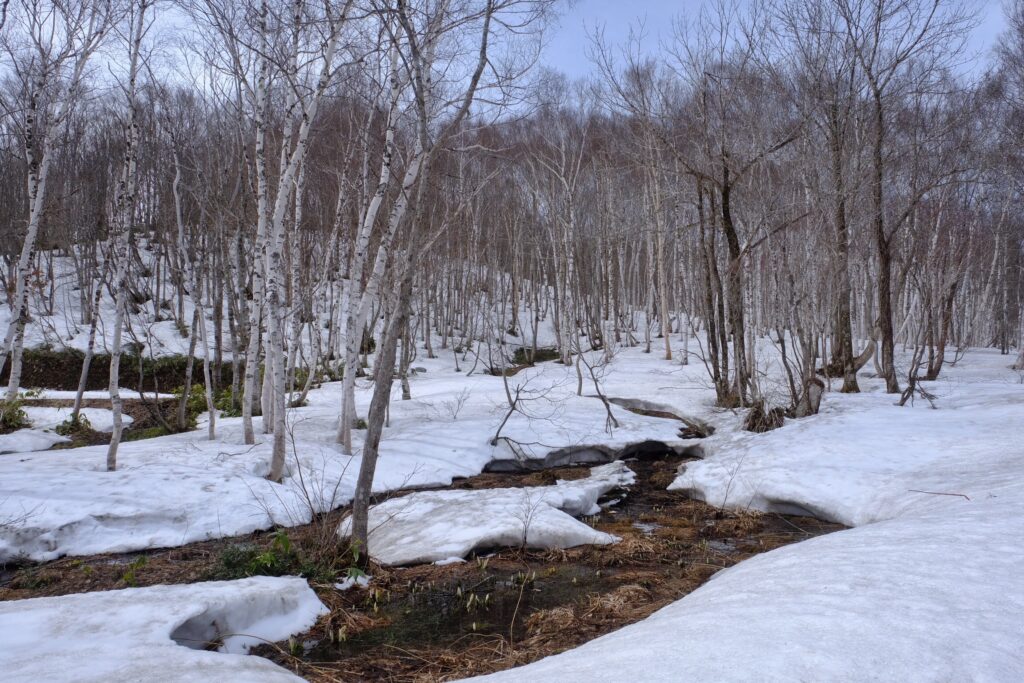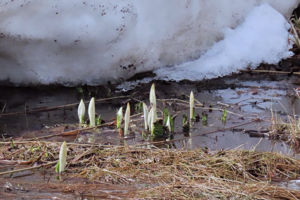 Skunk cabbage have started to bloom in the wetlands around the Okushigakogen and Takatengahara areas, where the snow is melting. The flowering is about two weeks earlier than usual. While Nagano City has experienced summer days exceeding 25℃, the highest temperature in the Shiga Highlands has been unusually high at 10℃ for this time of the year. Various plants are expected to bloom and reach their peak earlier than usual.