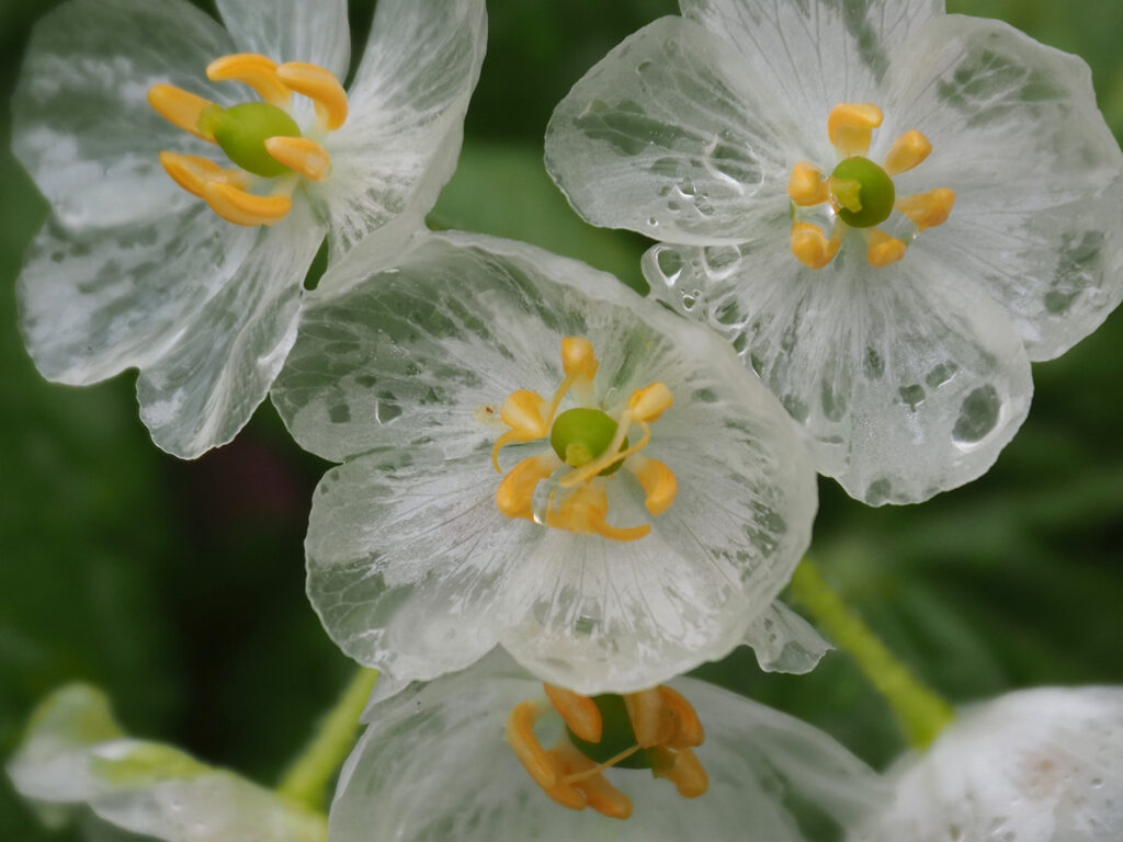 1日雨が降っている日にした見られない、ガラスのように透き通ったサンカヨウ