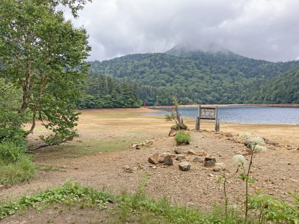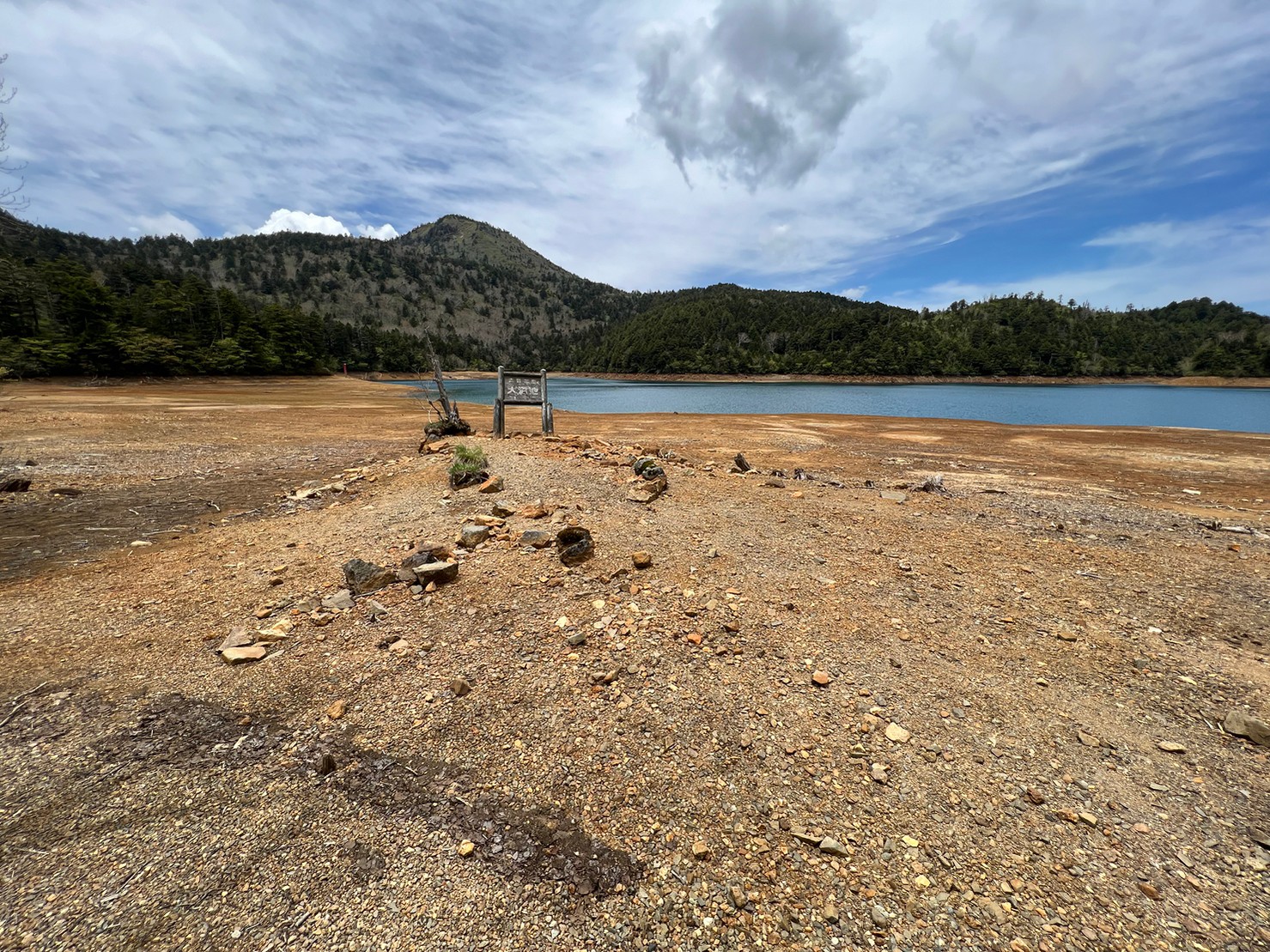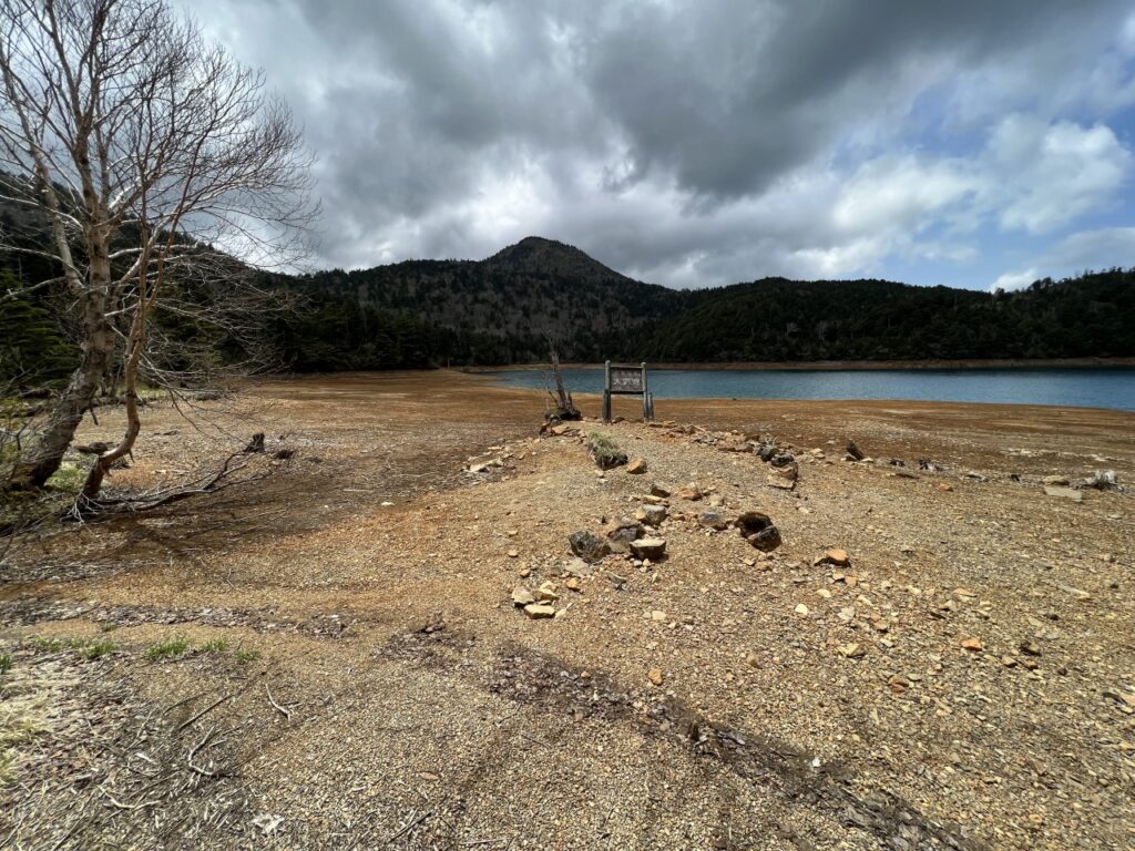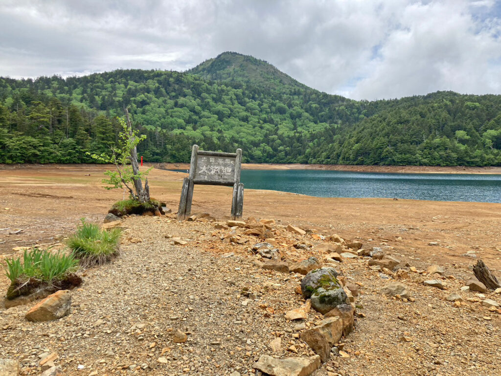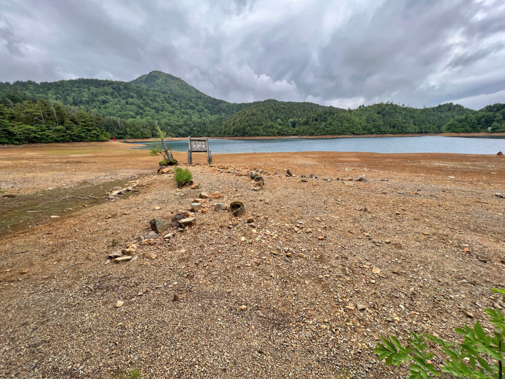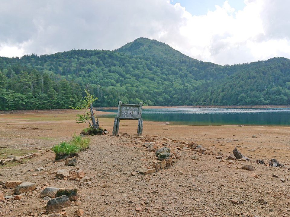 ※水位減少に伴い鳥居や看板のあたりが干上がっていますが、ここは普段水がある場所にあたりますので絶対に立ち入らないでください。環境保全のため皆様のご理解とご協力をお願いいたします。