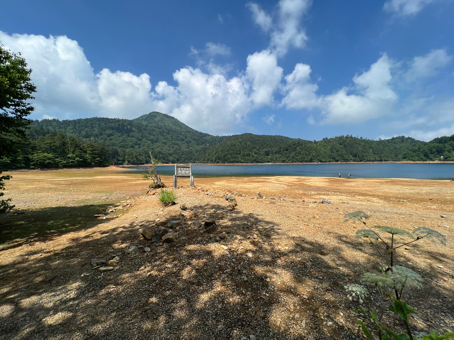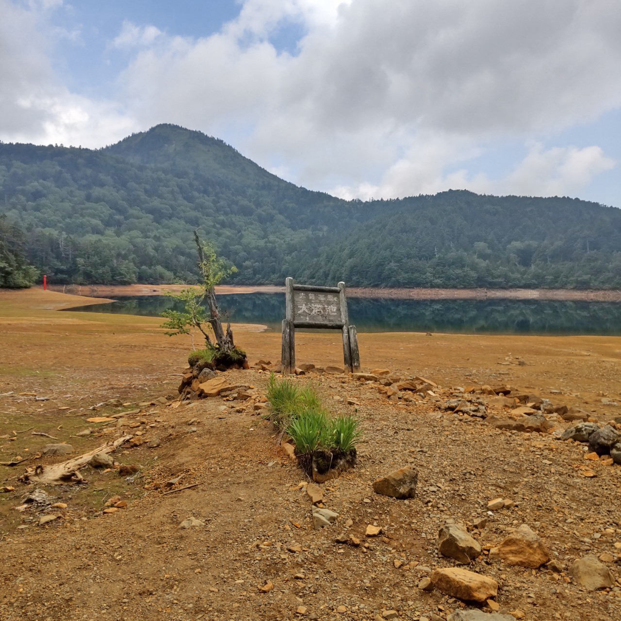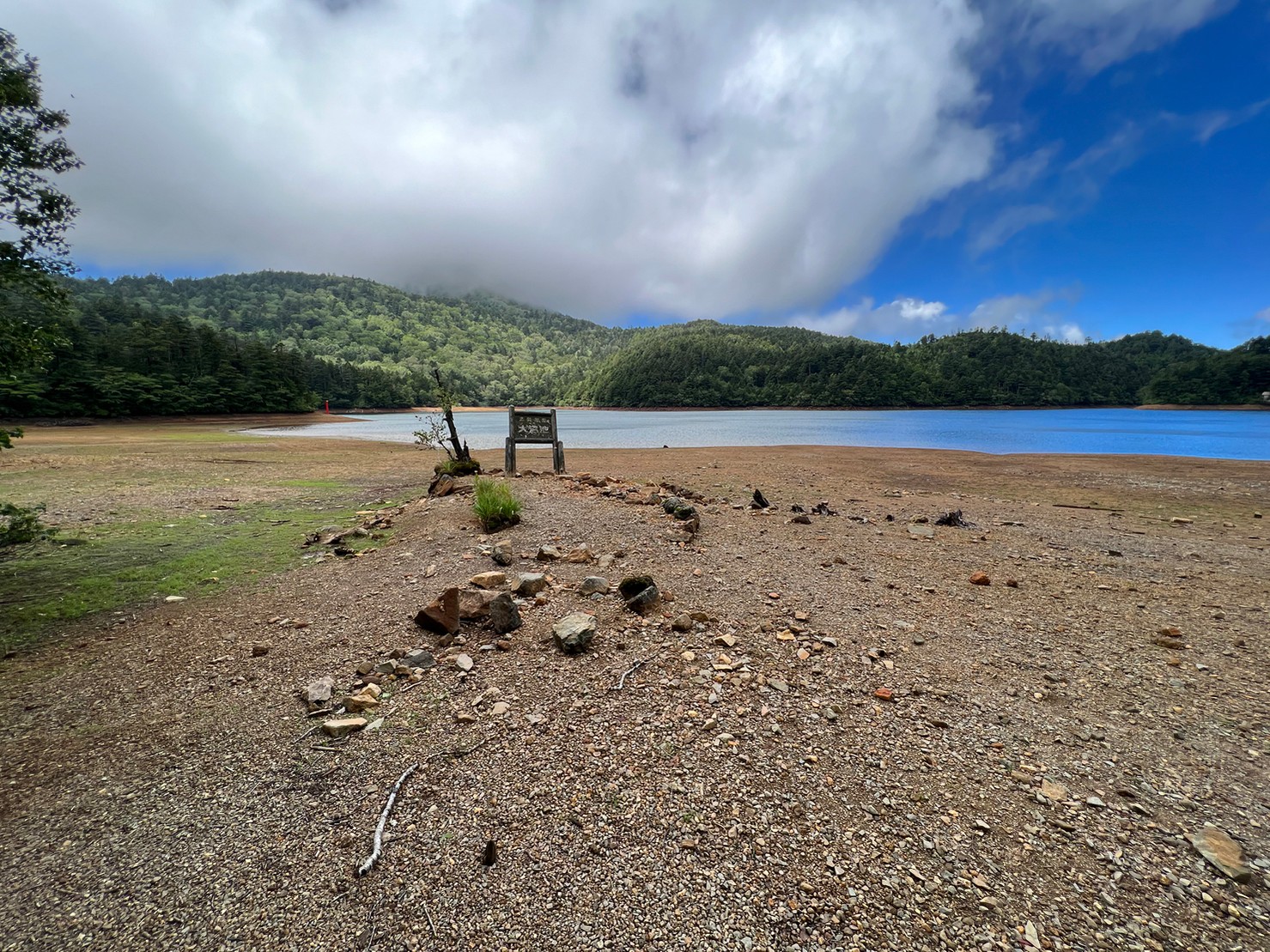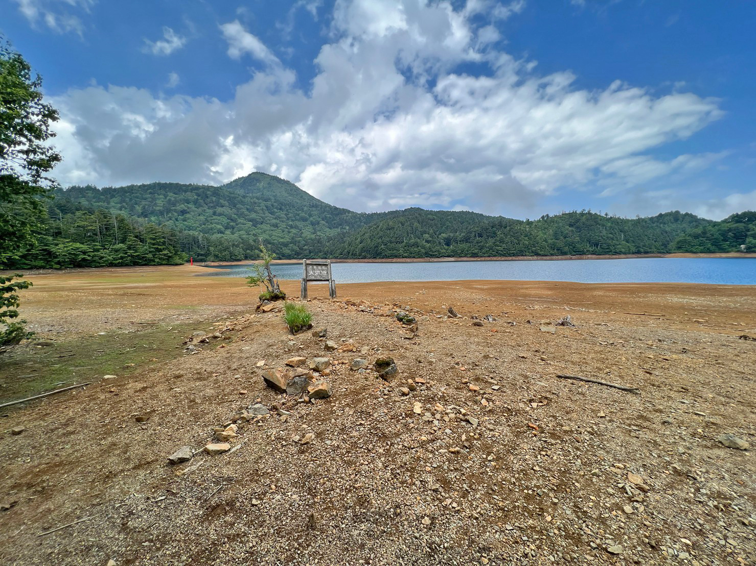 ※水位減少に伴い鳥居や看板のあたりが干上がっていますが、ここは普段水がある場所にあたりますので絶対に立ち入らないでください。環境保全のため皆様のご理解とご協力をお願いいたします。