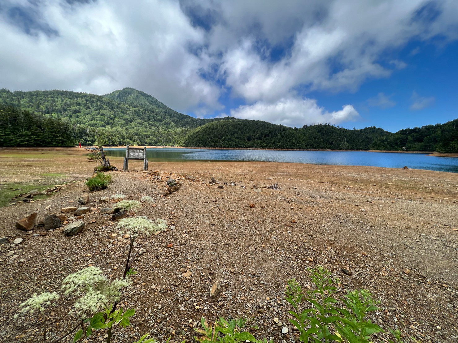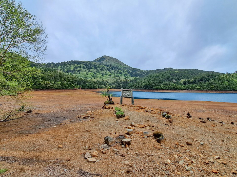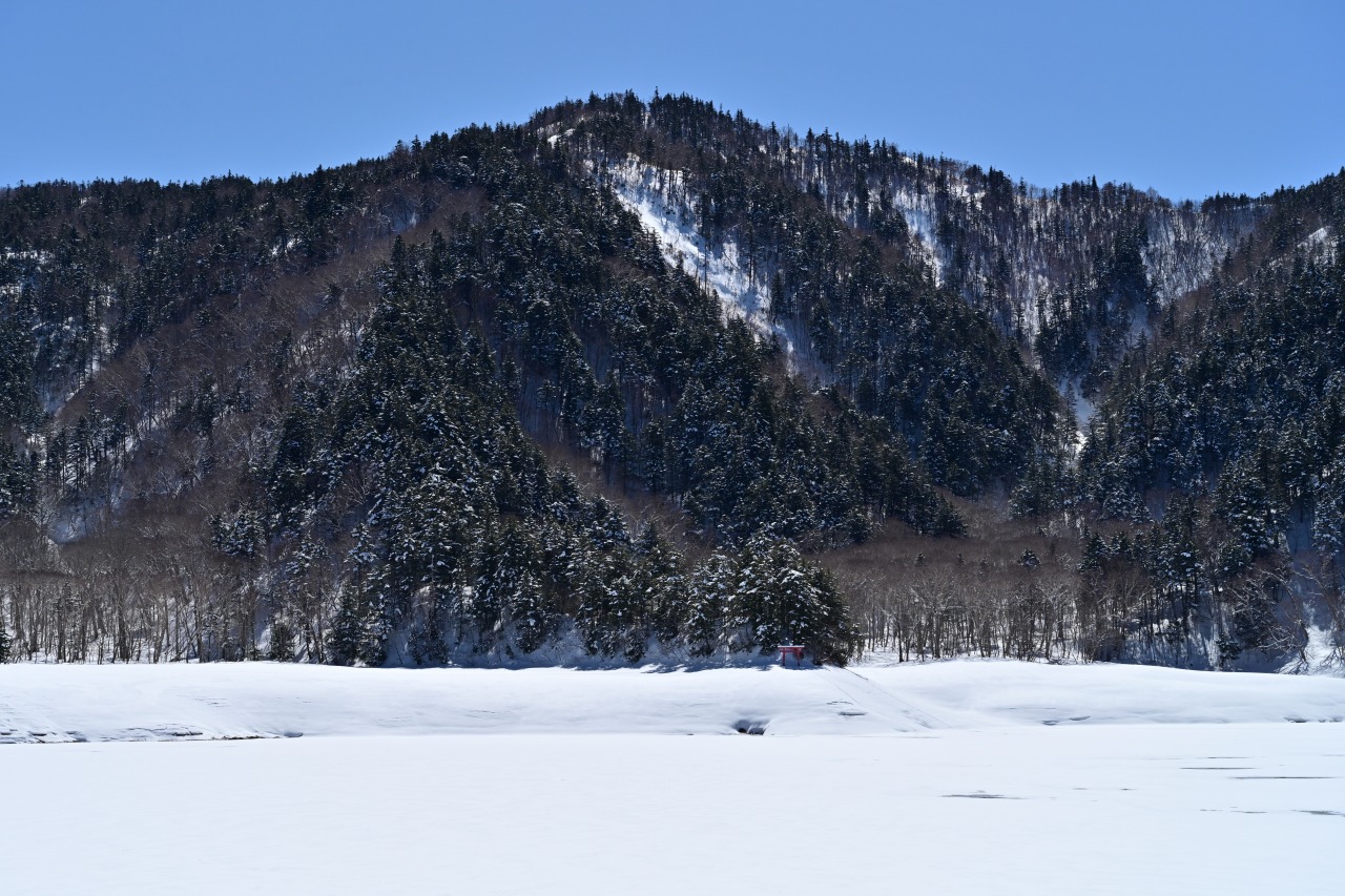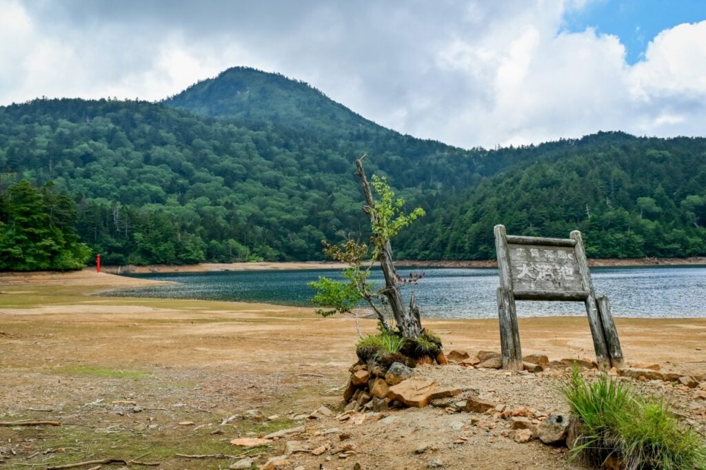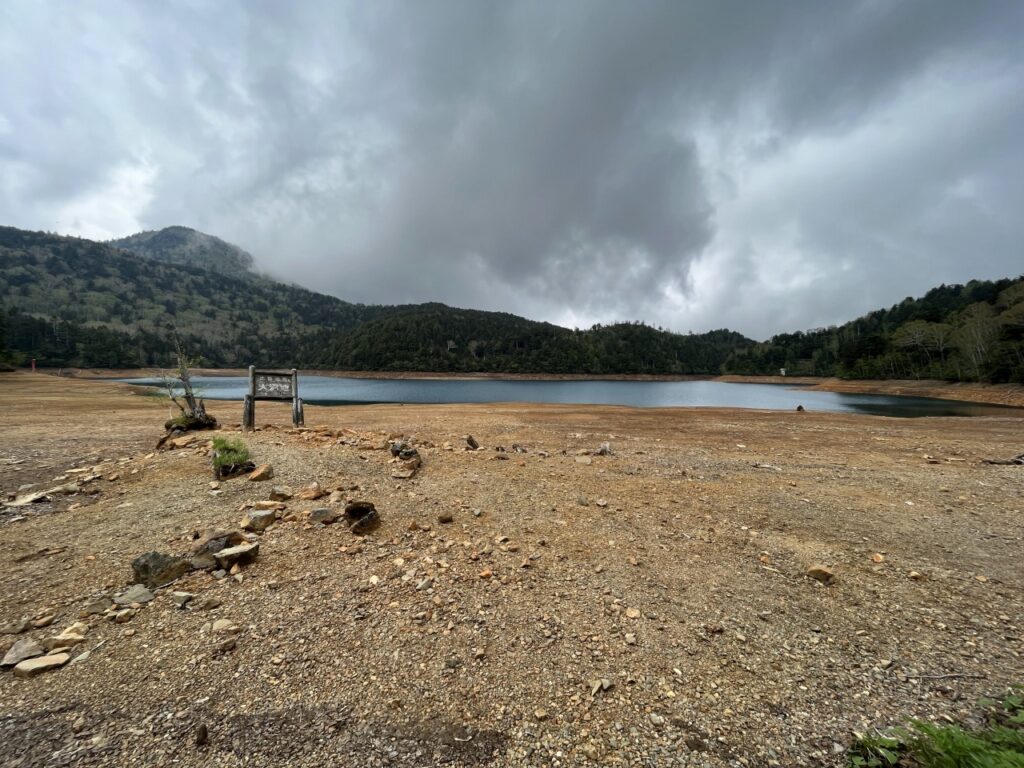 ※水位減少に伴い鳥居や看板のあたりが干上がっていますが、ここは普段水がある場所にあたりますので絶対に立ち入らないでください。環境保全のため皆様のご理解とご協力をお願いいたします。
