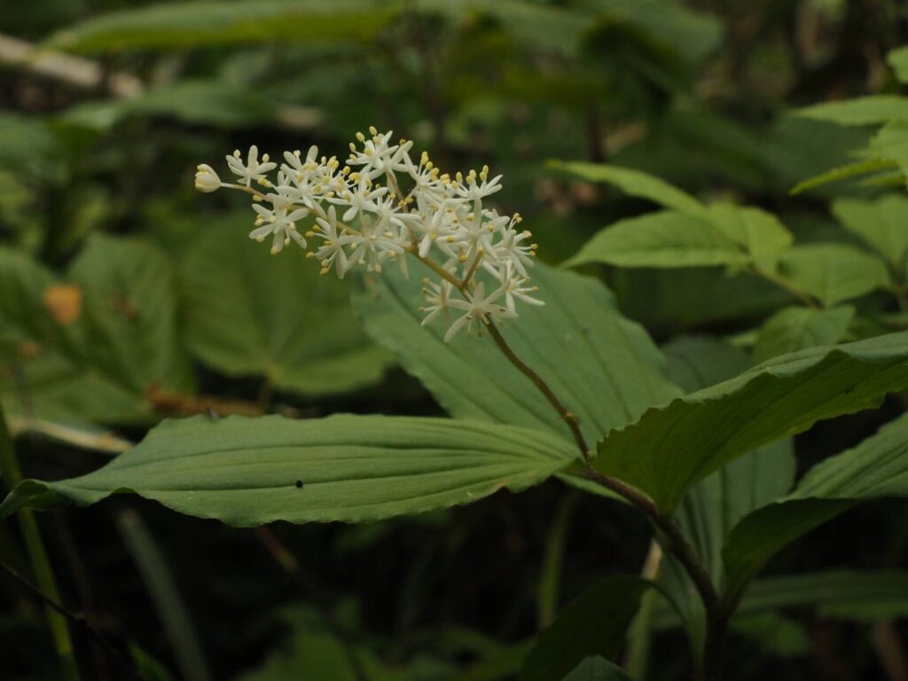 We conducted a preliminary survey of Okura Shindo. The blooming period of the Sankayo (umbrella leaf) has ended, and early summer plants are beginning to bloom.