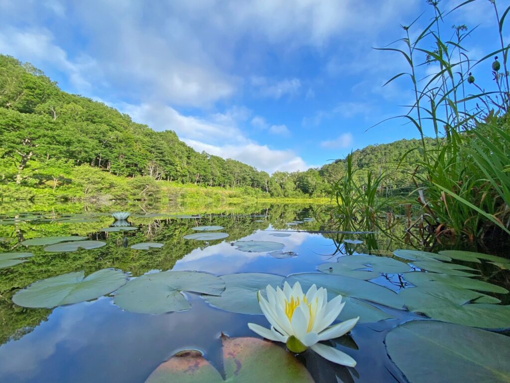 The Sunshine Trail, which takes you around the area of Shiga Kogen’s Hasuike Pond, Biwa Pond, and Ichinuma, has been certified as a “Forest Therapy Course” with proven healing effects, and the entire forest is filled with a pleasant breeze. Various alpine plants are in full bloom, providing soothing scenery for the eyes.