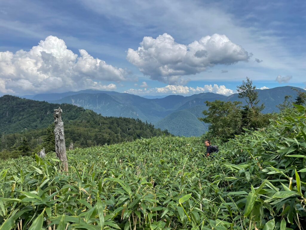 今年は、好天が続いたためか笹が以上に伸びており、ルートの確認が困難な場所があります。