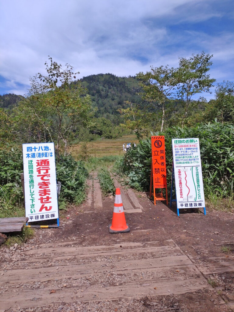 工事期間中は木道の歩行はできず、四十八池湿原の外周を沿うように設置しましたう回路へのご案内となります。