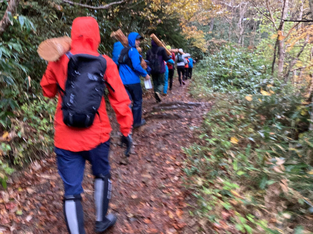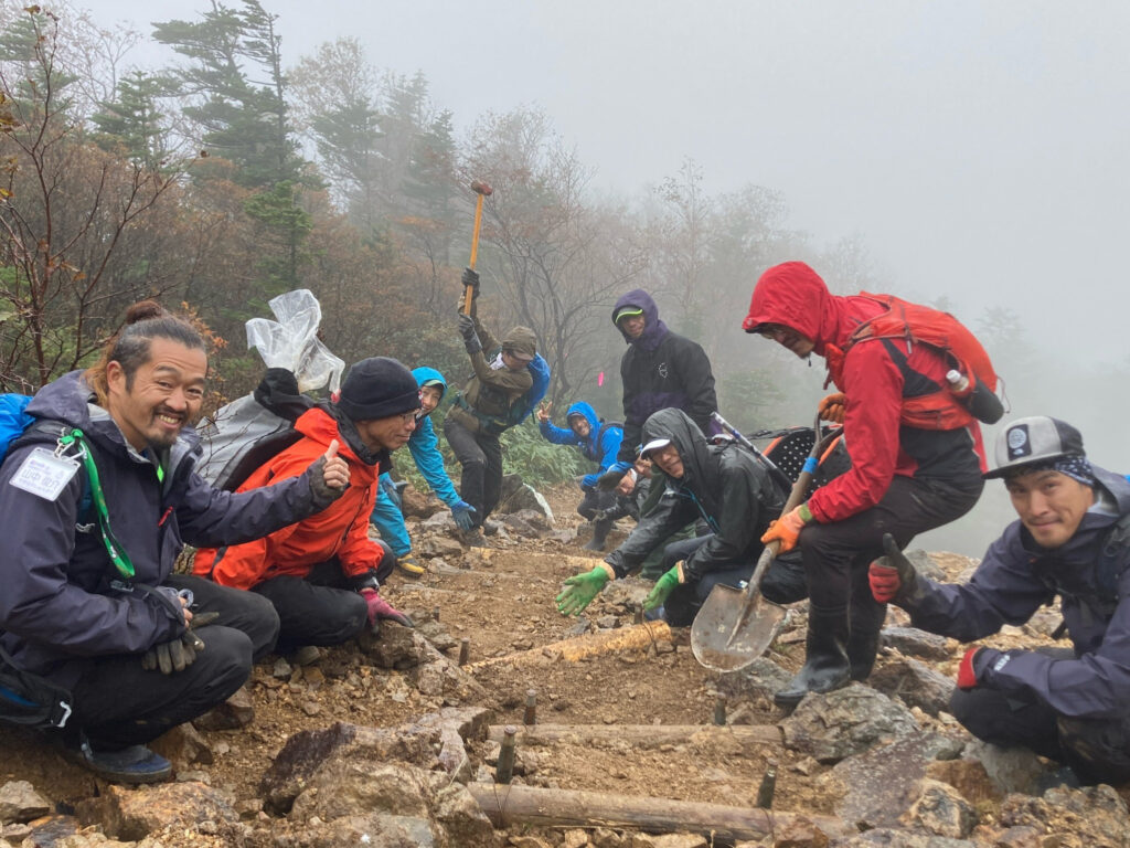 Despite the pouring rain ☂, we received assistance from trail runners to conduct repair work on the Mt.Akaishi hiking trail ⛰🔨. These trail runners proved to be incredibly powerful, carrying lumber all the way to the summit of Mt.Akaishi 💪.