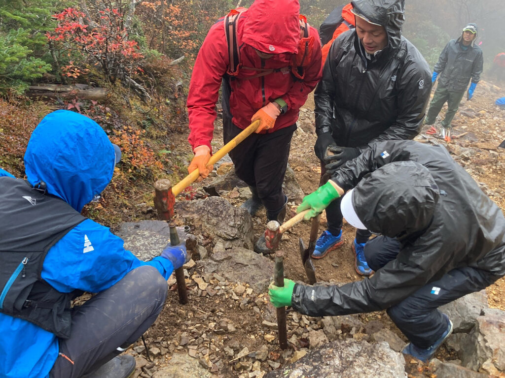 雨が降りしきる中☂トレイルランナーの皆さんにご協力いただき赤石山登山道の修繕作業を行いました⛰🔨