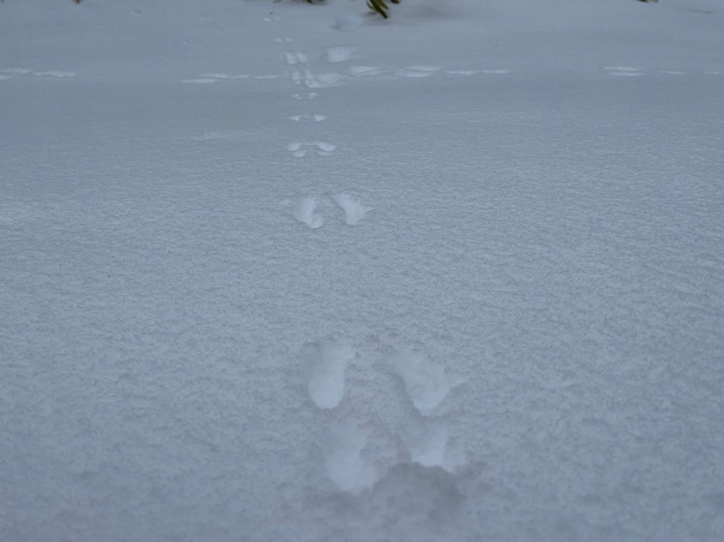 原生林の森の中は動物たちの足跡(足あと)がいっぱい!今回はキツネ(キツネ)とノウサギ🐇の足跡を辿り、2つの池の上を歩きました。帰り道では私たちの前をニホンリス(リス)が横切って行き、出来たての足跡も見ることが出来ました(見る)