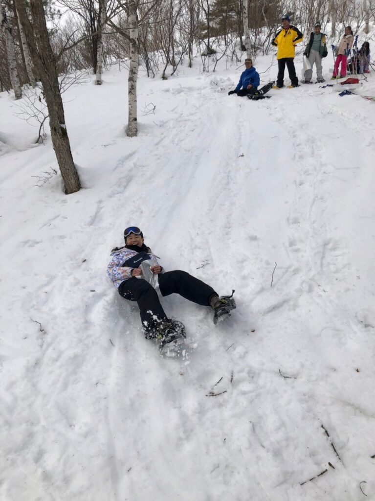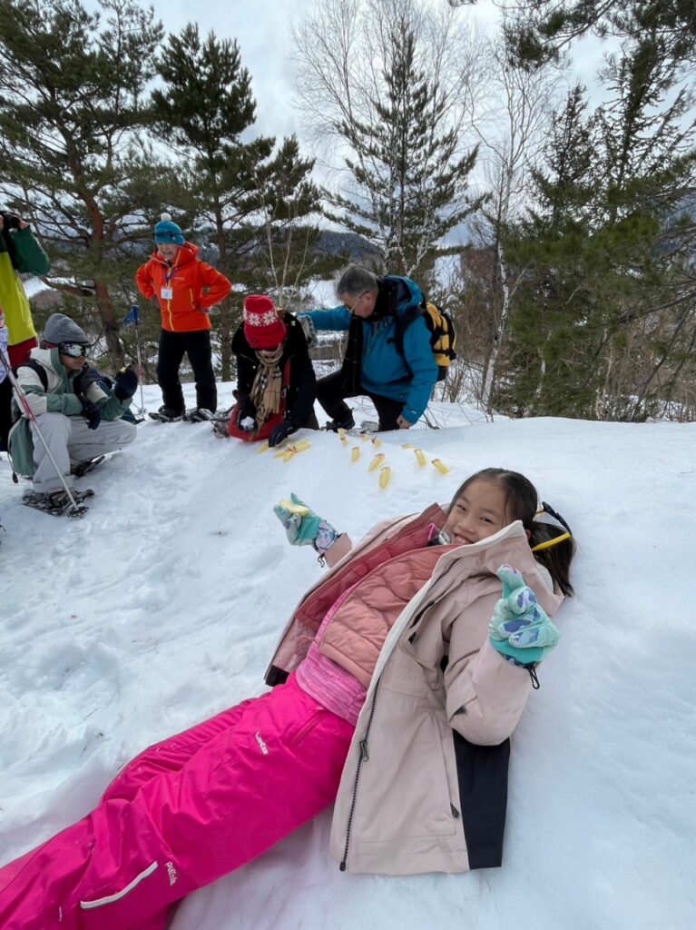 Eating sushi on the snow is a great choice. The sound of everyone’s laughter filled the quiet forest.