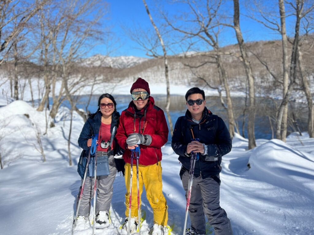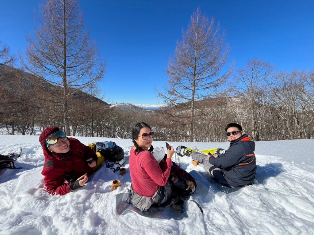 The morning group tour was joined by guests from Singapore 🇸🇬. Amidst the warm sunshine, they roamed freely through the forest🌲 and enjoyed tea time on a deserted snow terrace with a view of the Japan Alps🏔️. At the tour’s end, wild monkeys made a surprise greetings 🙈