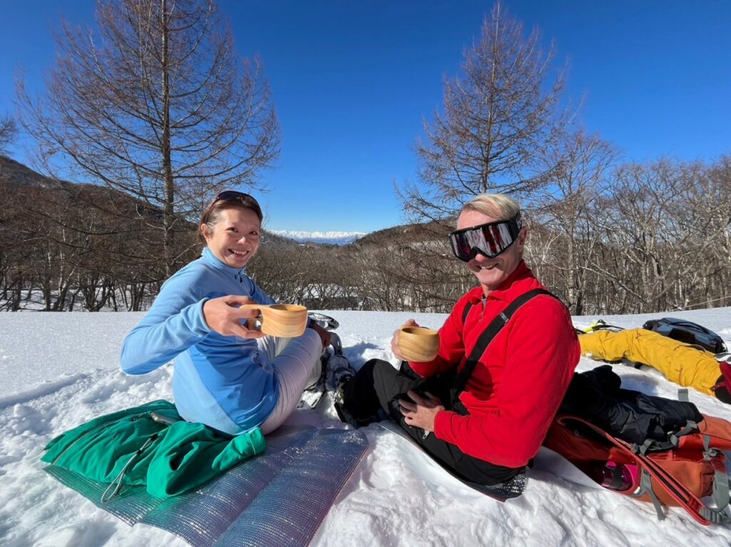 この日、午前のグループツアーにご参加いただいたのはシンガポール🇸🇬からのお客様。暖かい日差しの中、森の中を縦横無尽に歩き回り、誰もいない雪のテラスでは北アルプスを眺めながらお茶タイム。ツアーのゴールには野生のサルたちがサプライズ登場してくれました🐒