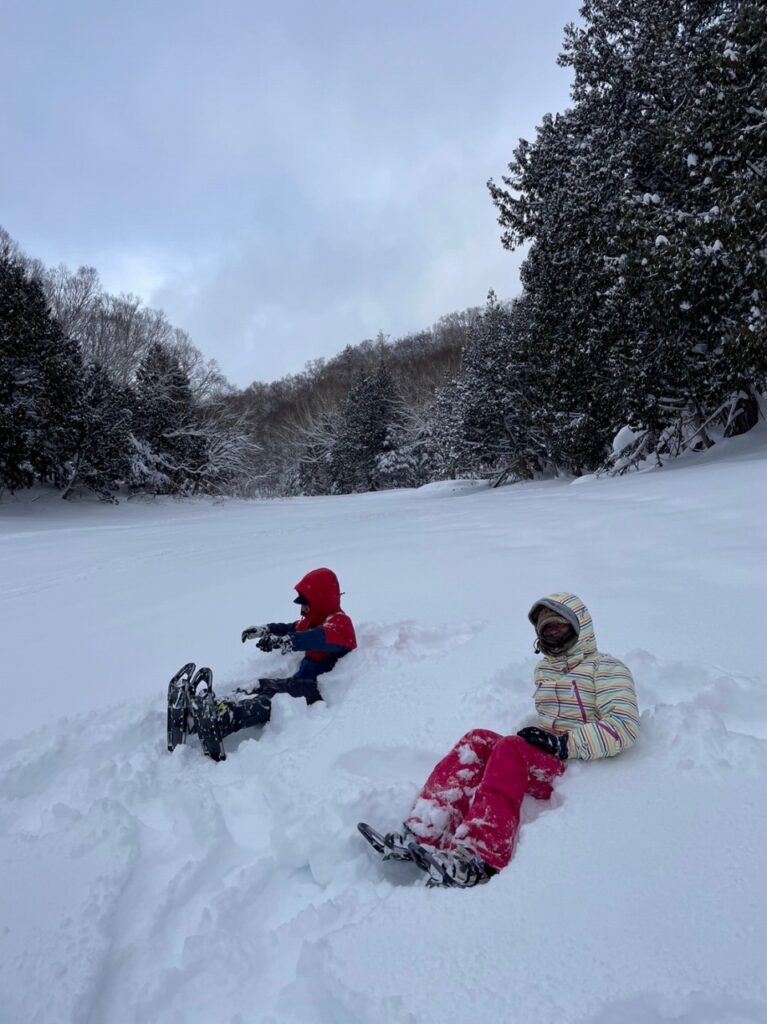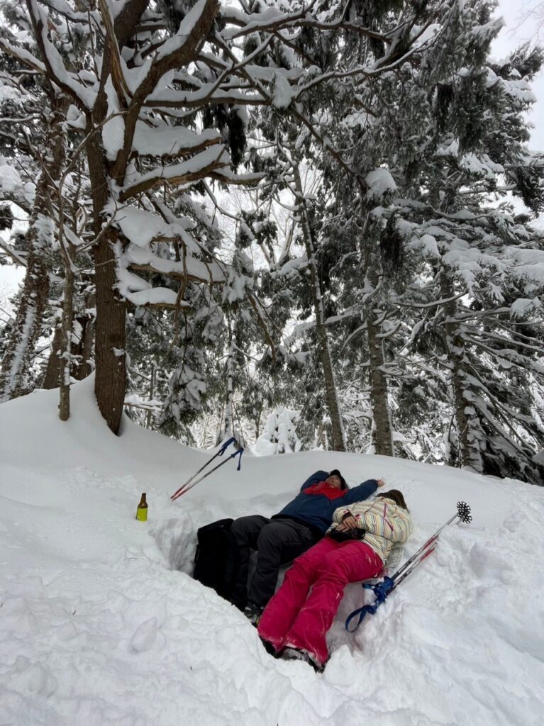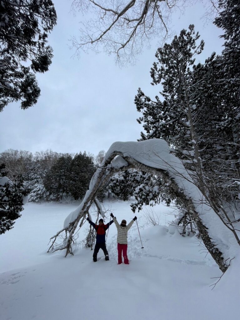 今回は冬の森探検ツアーへ大阪からのお二人をご案内🌲⛰❄原生林に囲まれた静かな長池でふかふかな雪のベッドで癒しのひと時♨