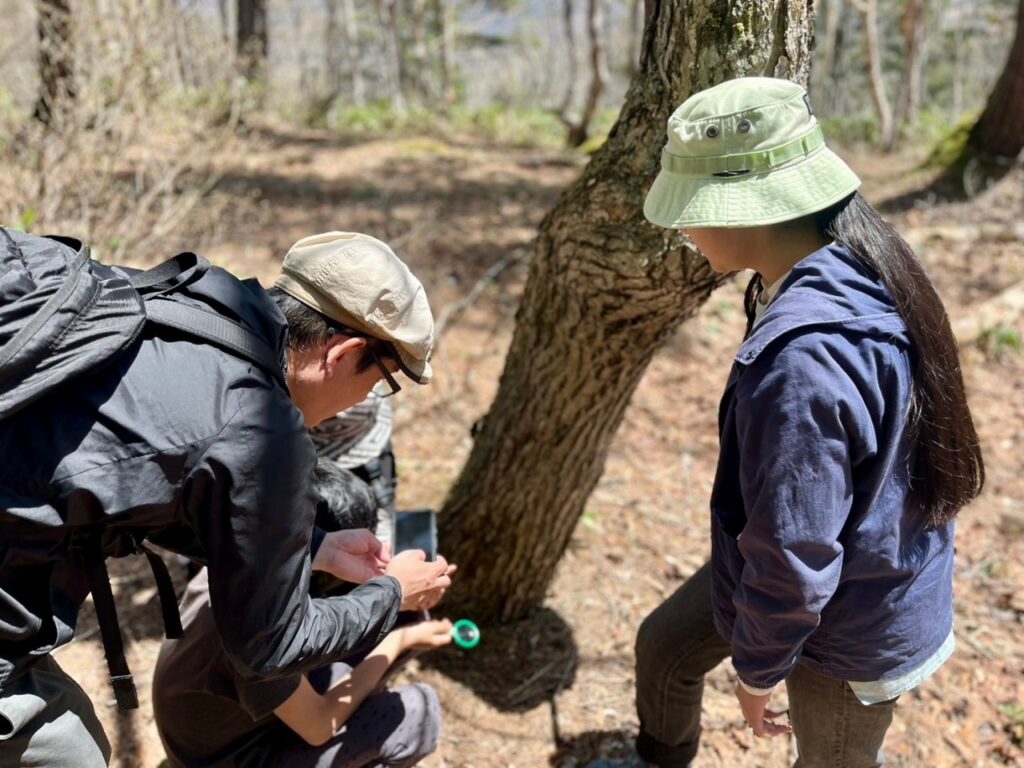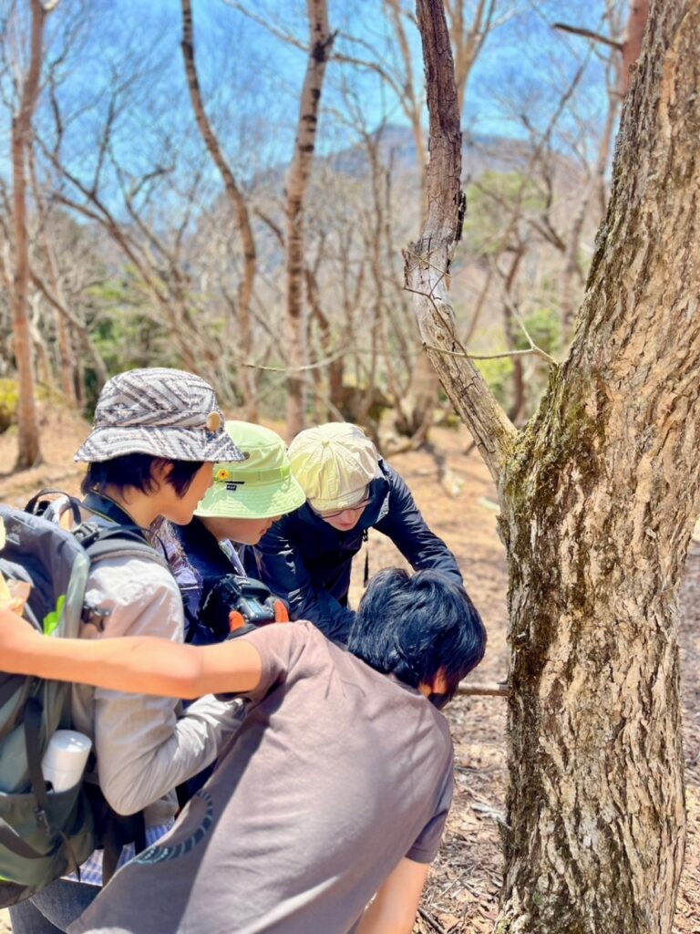 We discovered bear shelves, molehills made by Japanese moles, centipede burrows, unidentified insects crawling on dead trees, fresh claw marks deeply etched into tree bark, eating marks and droppings from hares and Japanese serows, various shaped pine cones, pine nuts left behind by squirrels resembling fried shrimp, and bark that could be used for drawing.