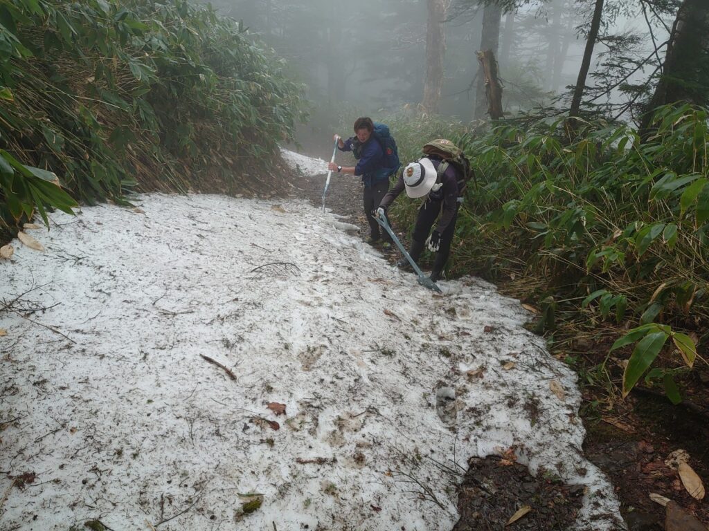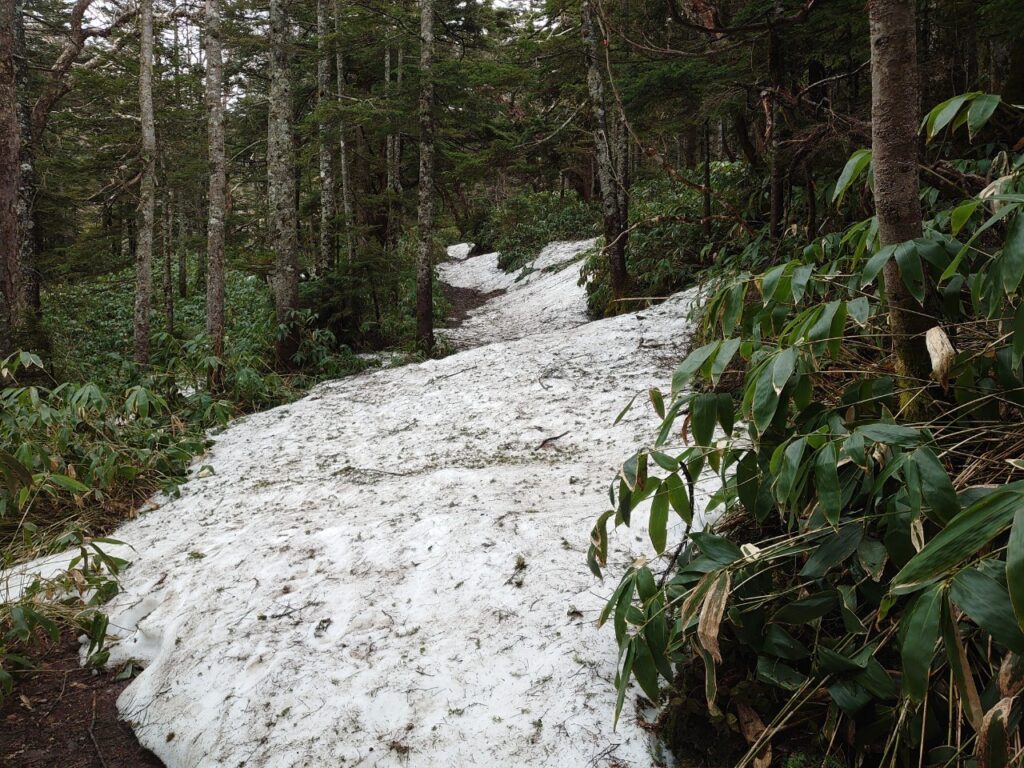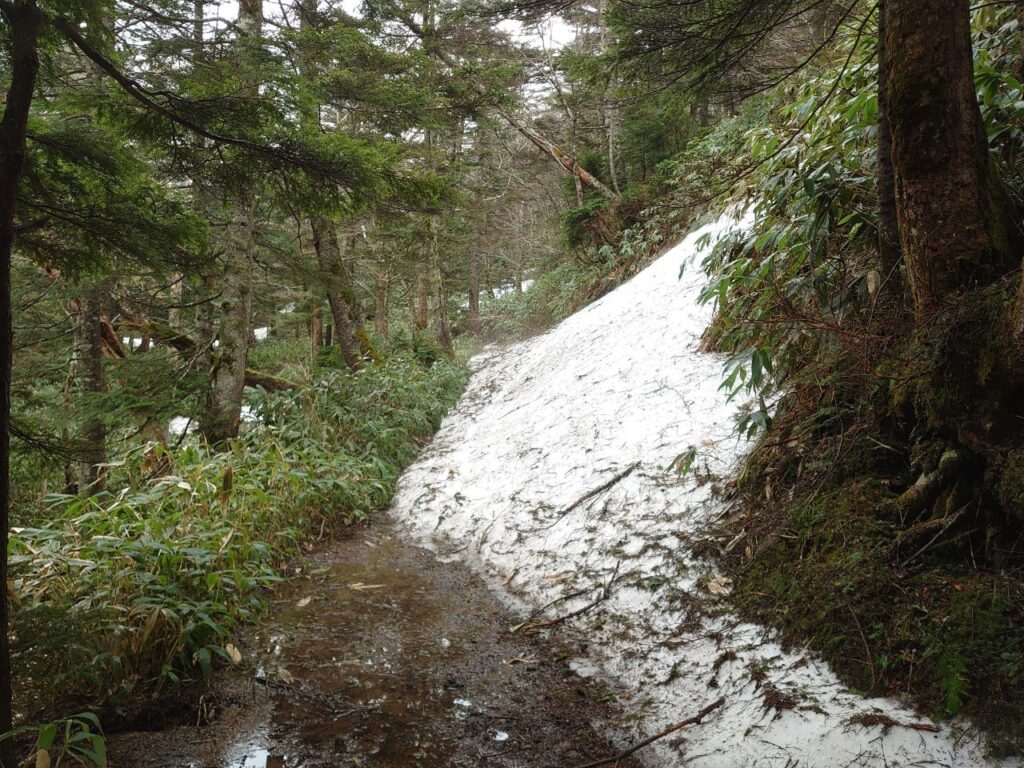 四十八池湿原など日当たりが良いところは雪が融けていますが、それまでの遊歩道で残雪を多く確認。