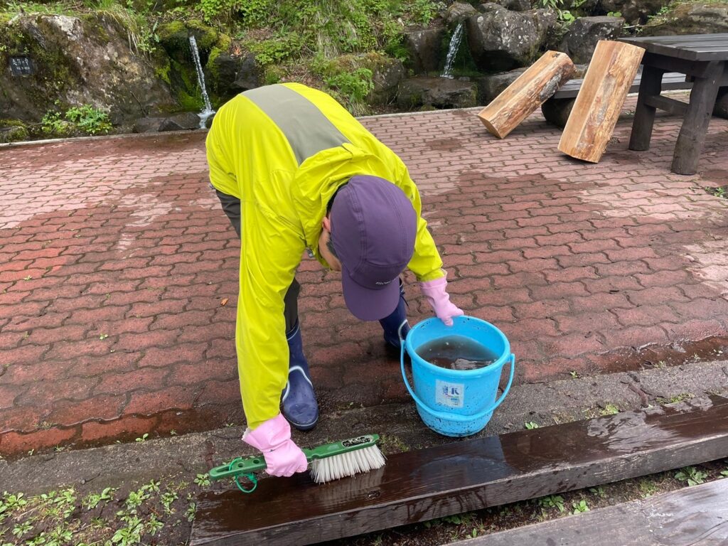 冬の間雪に埋まっていた「清水名水公園」のベンチ整備と公園清掃をしました💪志賀高原の原水から湧き出す清水のせせらぎを感じながらゆっくりとお過ごしいただけるスペースとなっています☕