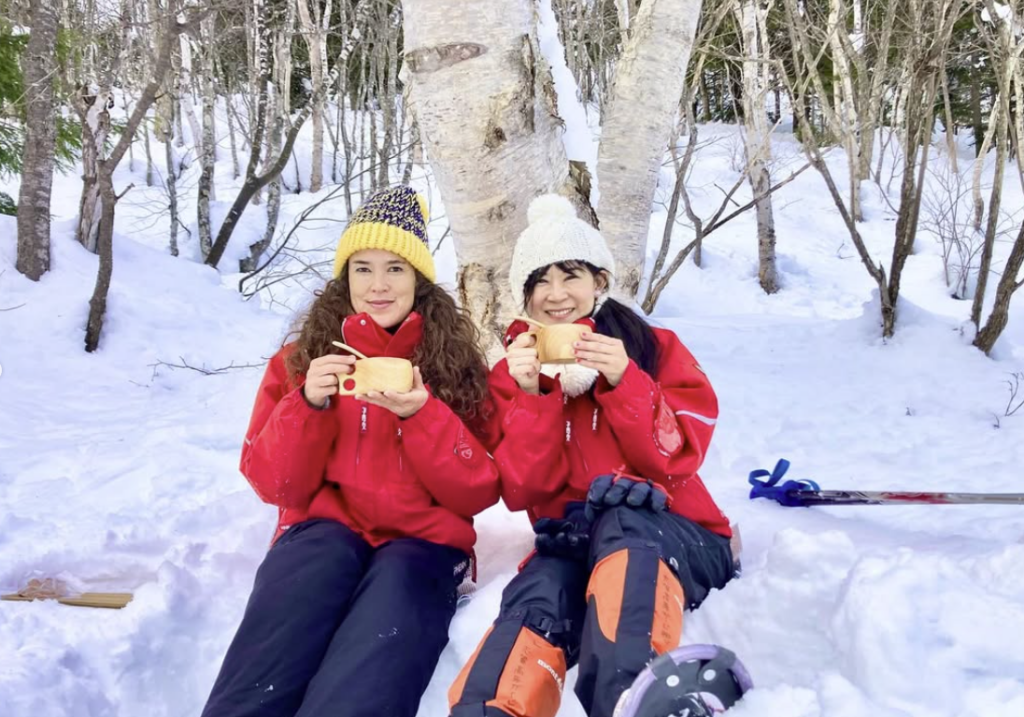 In the morning, under clear skies, we guided three guests from the USA🇺🇸 and Australia🇦🇺 to the summit of Mt. Higashidate🏔️. The breathtaking views and thrilling hip slides were a definite highlight! They also enjoyed a quiet and relaxing tea break away from the hustle and bustle of the ski slopes🫖