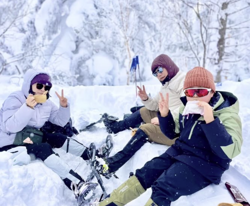 森の中でのティーブレイクでは、雪のソファに腰掛けながら、「ガイドさん、どうぞ!」とお菓子を分けてくれる優しさも😊✨