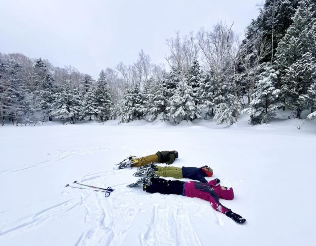 広々とした雪原では、ご家族3人で川の字になって寝転んだり、最後は自分たちの足跡👣しかない静かな雪原(池)を眺めながらのティーブレイク🫖