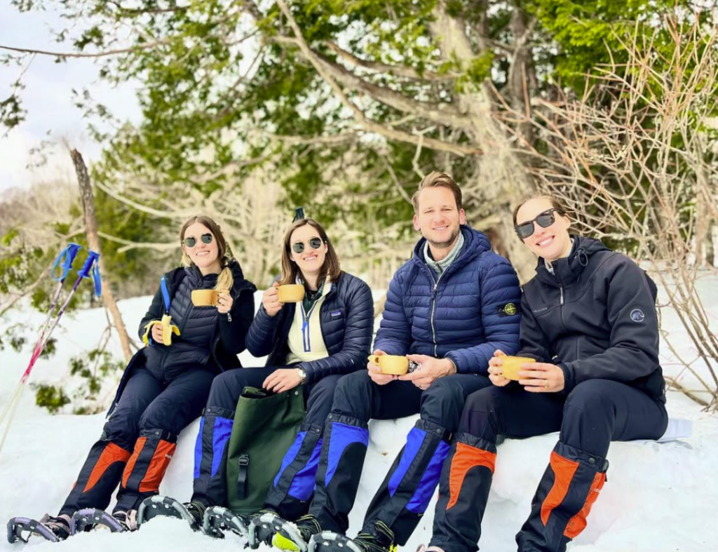 そしてツアーの締めくくりは、池のほとりで雪のベンチを作って、ほっこりお茶会タイム🫖