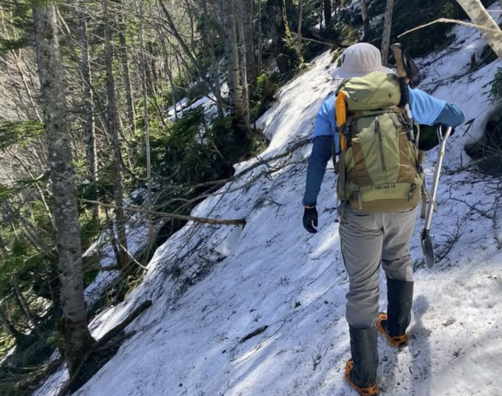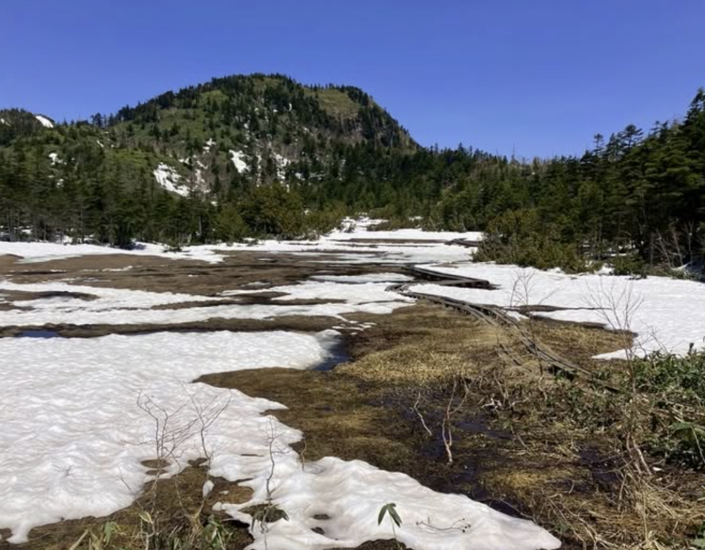 コースのほぼ全線で残雪が多くあります。残った雪が斜面になっており危険箇所あり、また、残雪により遊歩道が分かりづらい箇所も所々あります。