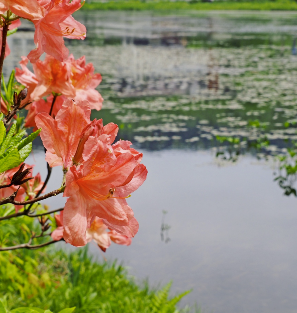 2025.07.05 夏/Summer景色/Scenery植物/Plant花/Flower 6月12日 蓮池の様子 蓮池 でレンゲツツジが見ごろを迎えています カエルの歌声も響き渡りはじめ、生き物たちがあふれています 志賀高原ガイド組合 が実施しているガイド付きトレッキングでは、おすすめポイントへもご案内いたします